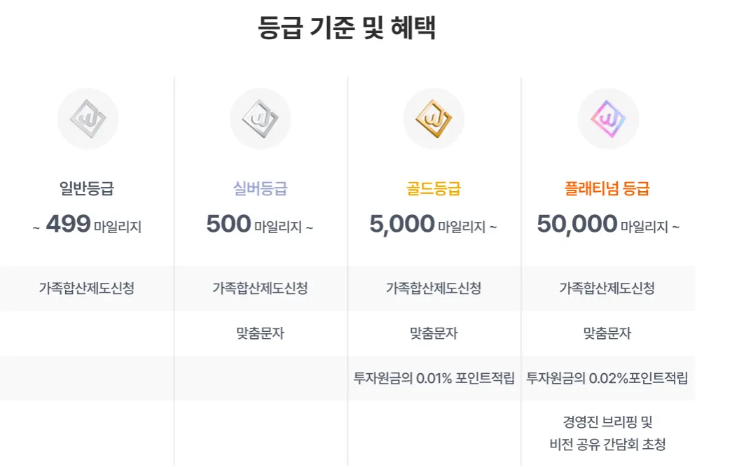 투자 금액에 따라 마일리지가 적립되며, 이를 바탕으로 등급이 결정됩니다.