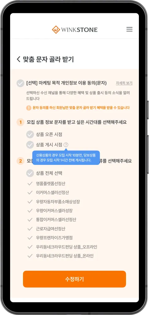 맞춤 문자를 수신하고 싶으시다면 “마케팅 목적 개인정보 이용 동의”를 해주셔야 해요!